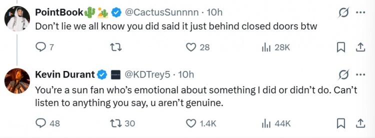 杜兰特又回应道:“ 你是一位太阳的球迷,对我的某些行为或不作为感到情绪激动。但我无法听取你的任何意见,因为你并不真诚。”